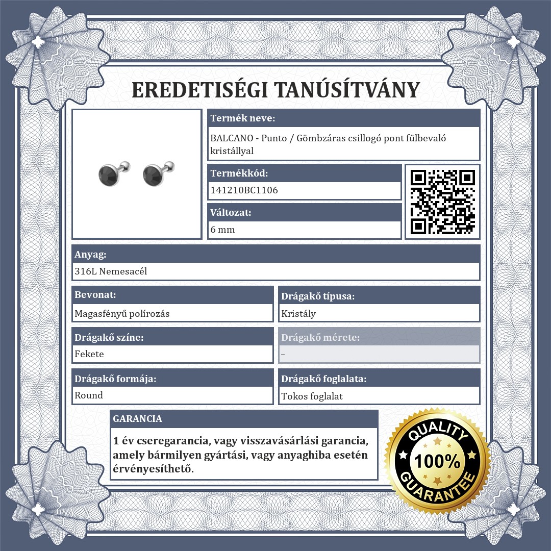 316L orvosi rozsdamentes acélból készült bedugós, pont fülbevaló. Csillogó, fekete színű kristállyal díszítve és menetes gömbzárral.