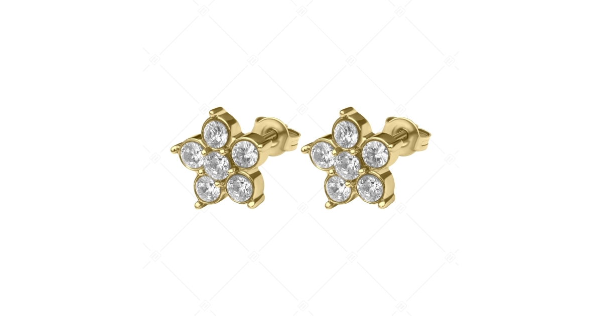 Elegáns, virág formájú bedugós fülbevaló. Szikrázó, víztiszta cirkónia ékkövekkel kirakott, antiallergén 316L nemesacél ékszer, 18K arany bevonattal.