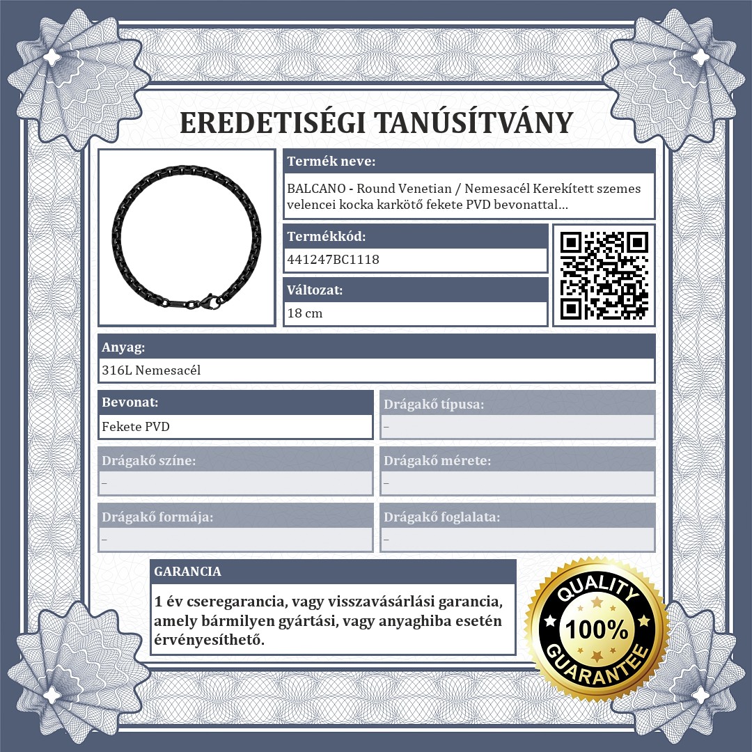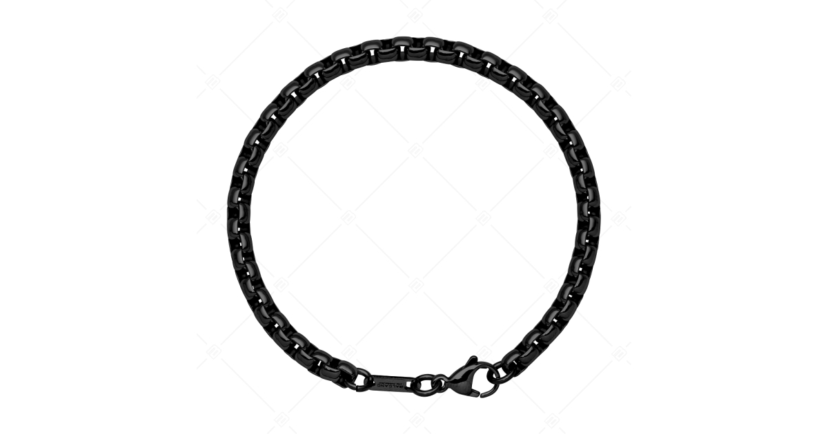 Kiváló minőségű, antiallergén, orvosi 316L nemesacél, kerekített velencei kocka lánc típusú karlánc,fekete PVD bevonattal. Anyagának köszönhetően használat során nem kopik meg fénye, nem rozsdásodik, nem mattul el.