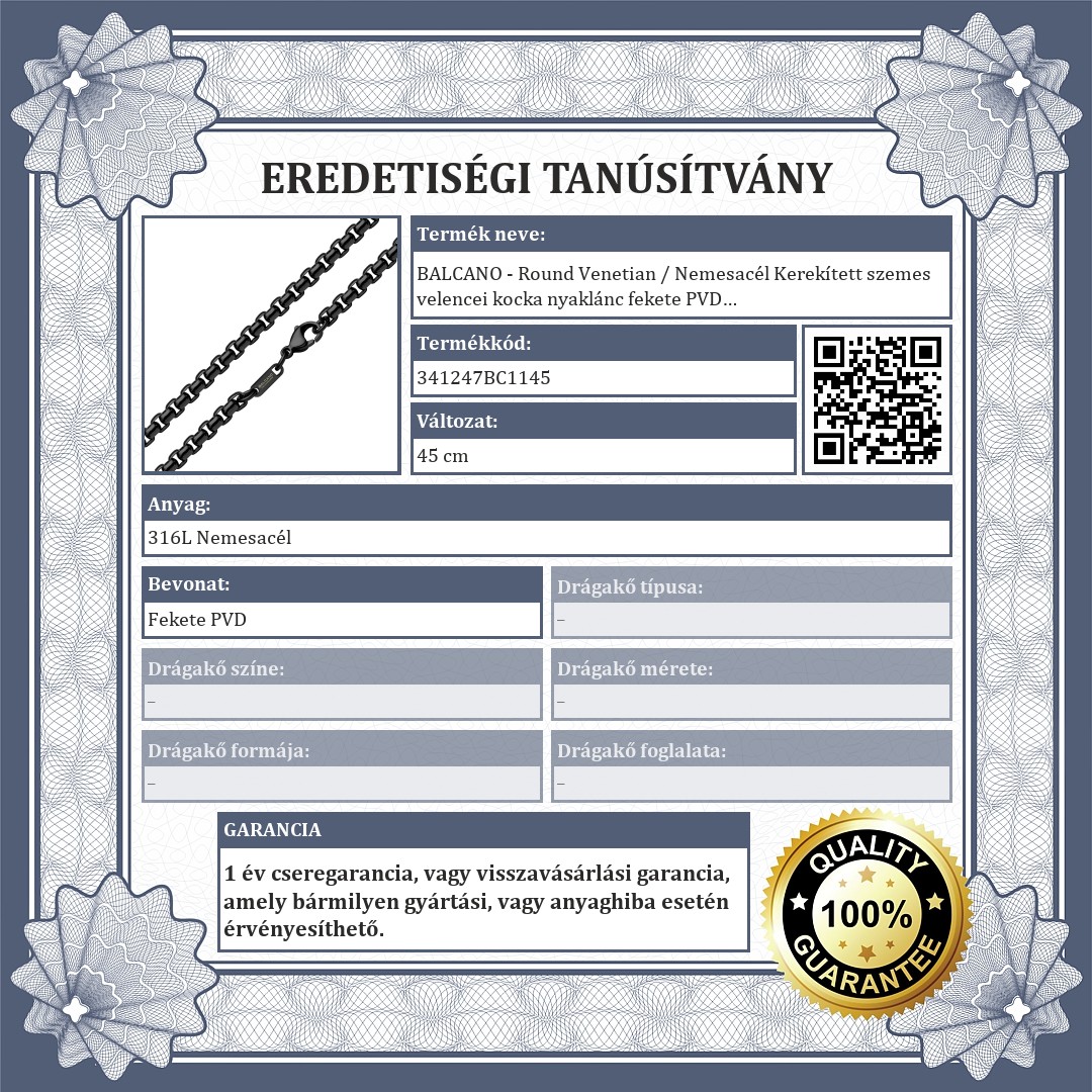 Kiváló minőségű, antiallergén, 316L nemesacél, kerekített velencei kocka lánc típusú nyaklánc, fekete PVD bevonattal. Anyagának köszönhetően használat során nem kopik meg fénye, nem rozsdásodik, nem mattul el.