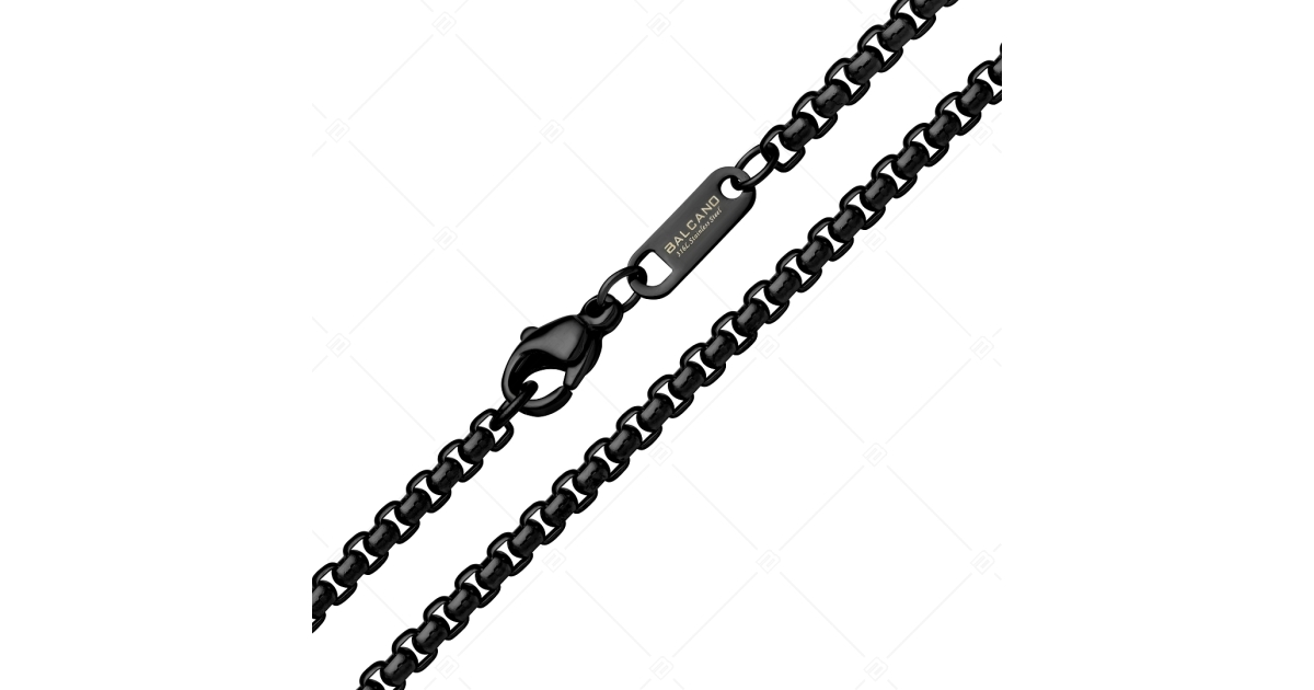 Kiváló minőségű, antiallergén, 316L nemesacél, kerekített velencei kocka lánc típusú nyaklánc, fekete króm PVD bevonattal. Anyagának köszönhetően használat során nem kopik meg fénye, nem rozsdásodik, nem mattul el.