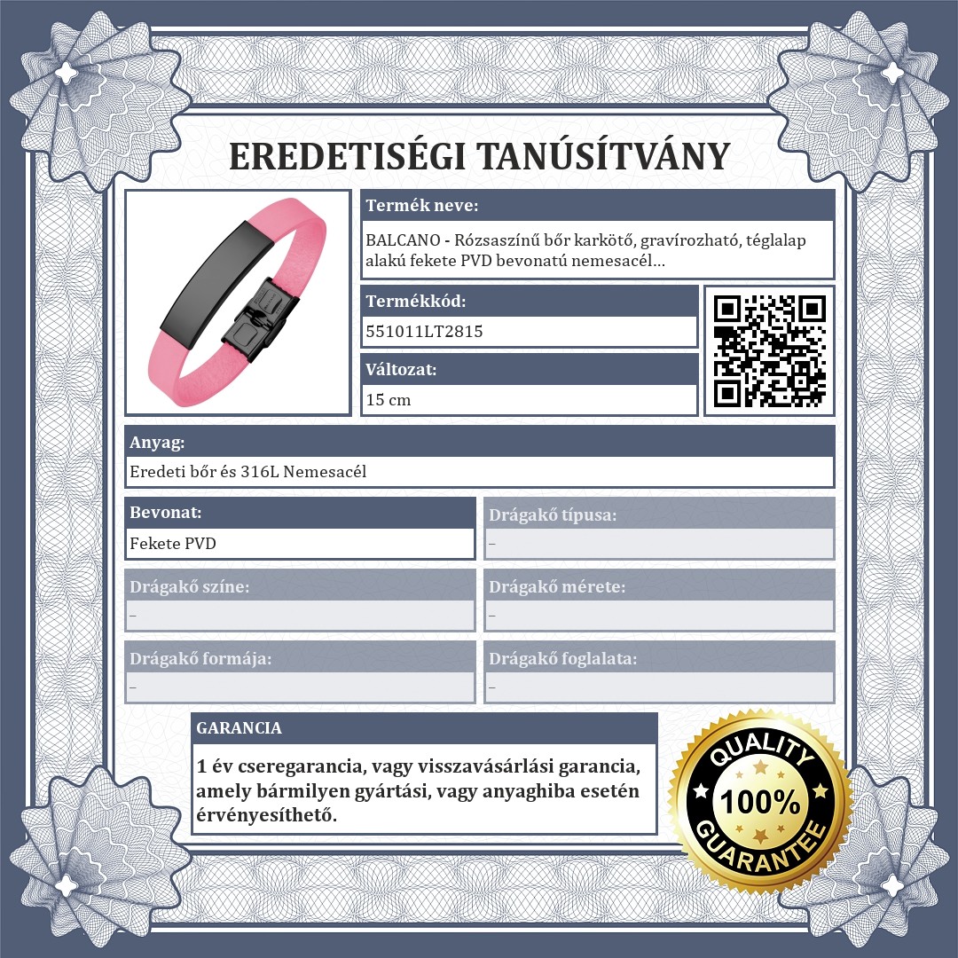 Rózsaszínű, valódi marhabőr karkötő, amit egy téglalap alakú, fekete PVD bevonatú 316L nemesacél fejrész díszít. Felülete sima, így egyedi ékszer készíthető belőle gravírozással.