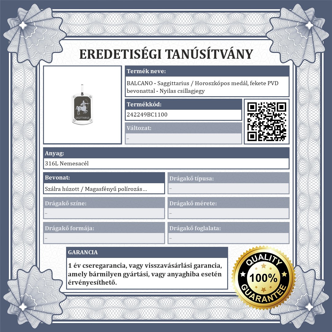 Antiallergén, nemesacél, téglalap alakú horoszkópos medál a Nyilas csillagjegy képével díszítve. 316L orvosi, rozsdamentes acél ékszer, amely anyagának köszönhetően rendkívül tartós. Középen található a bemaratással és festéssel készült állatövi jegyek szimbóluma. Magasfényű polírozással és matt, fekete PVD bevonattal.