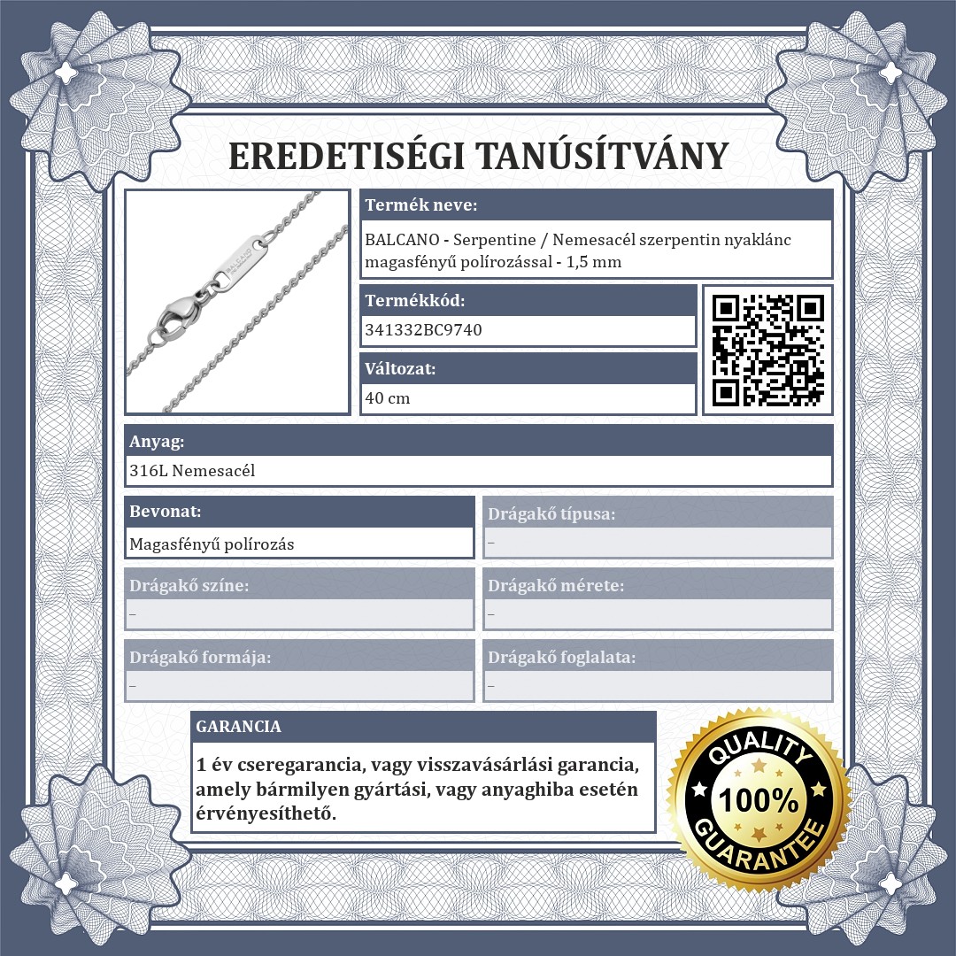 Klasszikus, elegáns nyaklánc. Kiváló minőségű, antiallergén 316L orvosi nemesacélból készült, úgynevezett szerpentin szemes lánc. Magasfényű polírozással és biztonságos delfin kapoccsal.