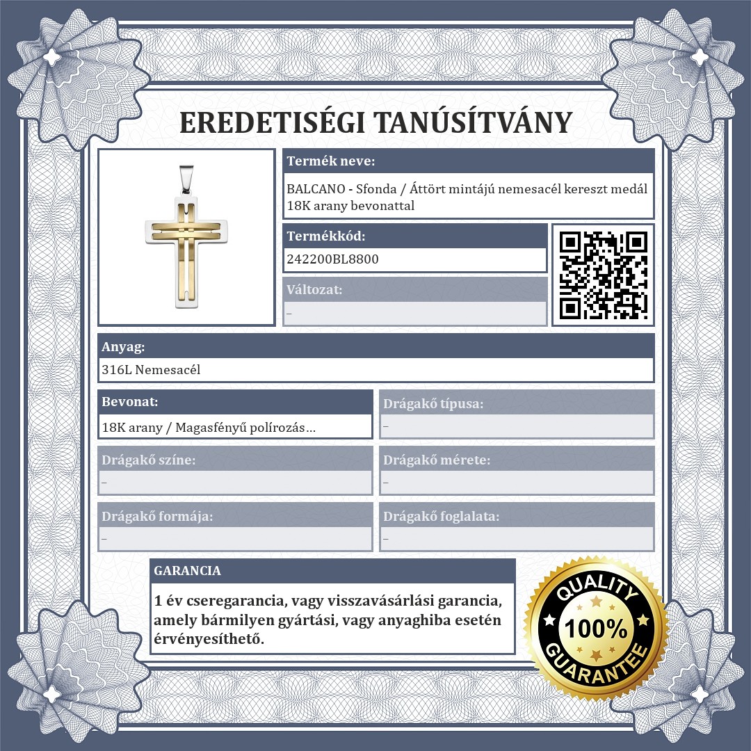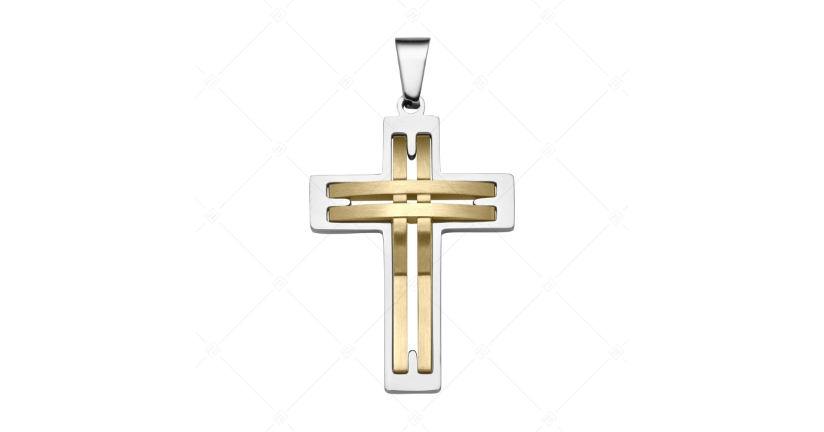 Prémium minőségű, 316L orvosi rozsdamentes acélból készült, ezüst színű, áttört formájú kereszt alakú medál, középen 18K arany bevonatos matt felülettel. Magasfényű polírozással készült, anyagának köszönhetően rendkívül tartós. A medál többféle BALCANO lánccal szettben is megvásárolható webáruházunkban.
