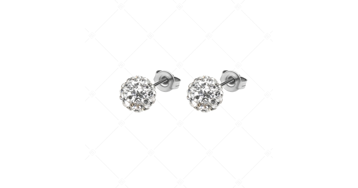 Divatos, ragyogó cseh kristályokkal díszített bedugós fülbevaló. Gömb alakú fejrészét apró víztiszta kövek díszítik. 316L orvosi, antiallergén nemesacél ékszer, magasfényű polírozással, biztonságos pillangó zárral.