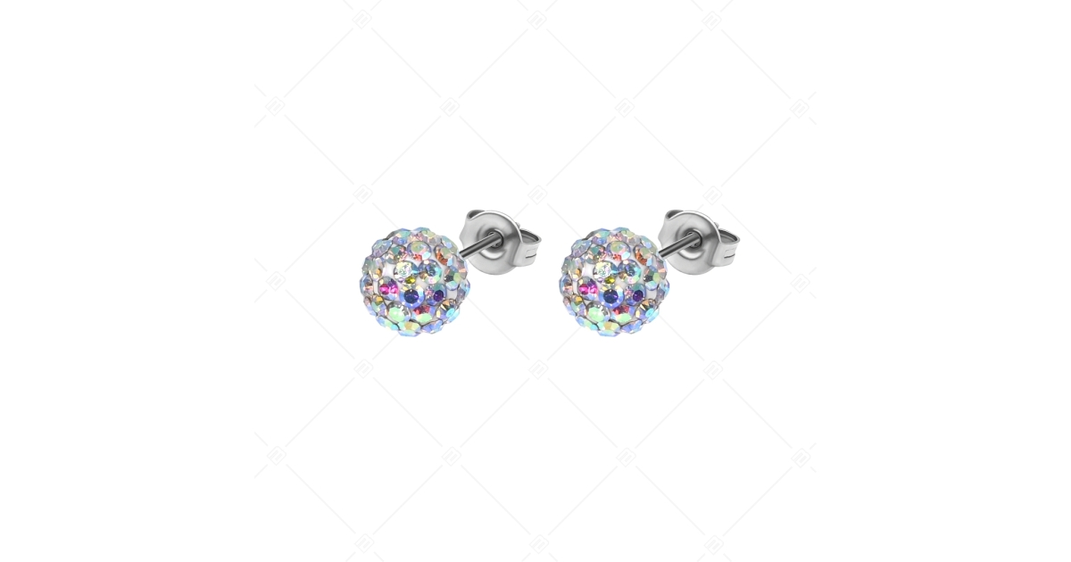 Divatos, ragyogó cseh kristályokkal díszített bedugós fülbevaló. Gömb alakú fejrészét apró, színjátszó AB kövek díszítik. 316L orvosi, antiallergén nemesacél ékszer, magasfényű polírozással, biztonságos pillangó zárral.