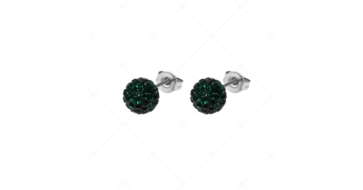 Divatos, ragyogó cseh kristályokkal díszített bedugós fülbevaló. Gömb alakú fejrészét apró smaragdzöld színű kövek díszítik. 316L orvosi, antiallergén nemesacél ékszer, magasfényű polírozással, biztonságos pillangó zárral.