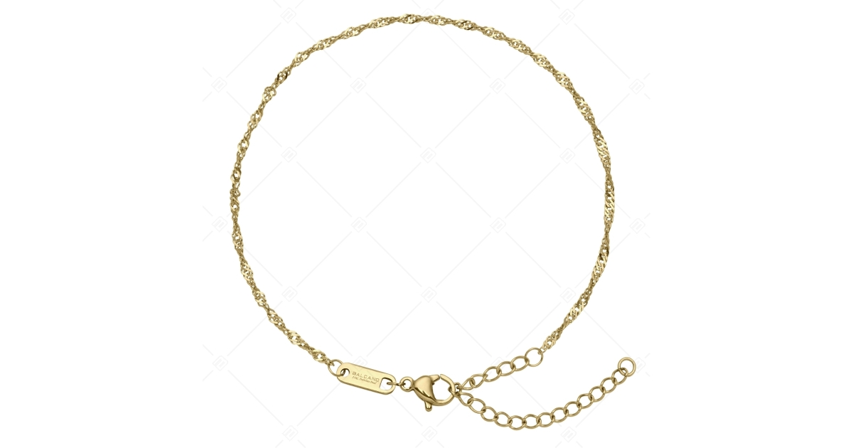 Szingapúri típusú, azaz csavart pancer láncos bokalánc, 18K arany bevonattal ellátva. Antiallergén, 316L orvosi nemesacél ékszer. Kiváló minőségének köszönhetően rendeltetésszerű használat során nem mattul el, nem rozsdásodik.