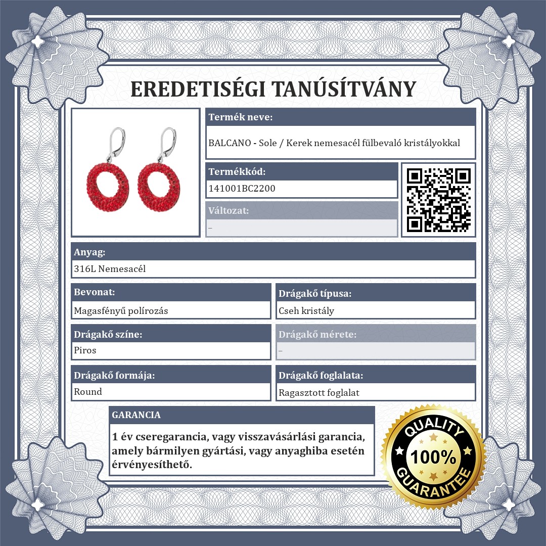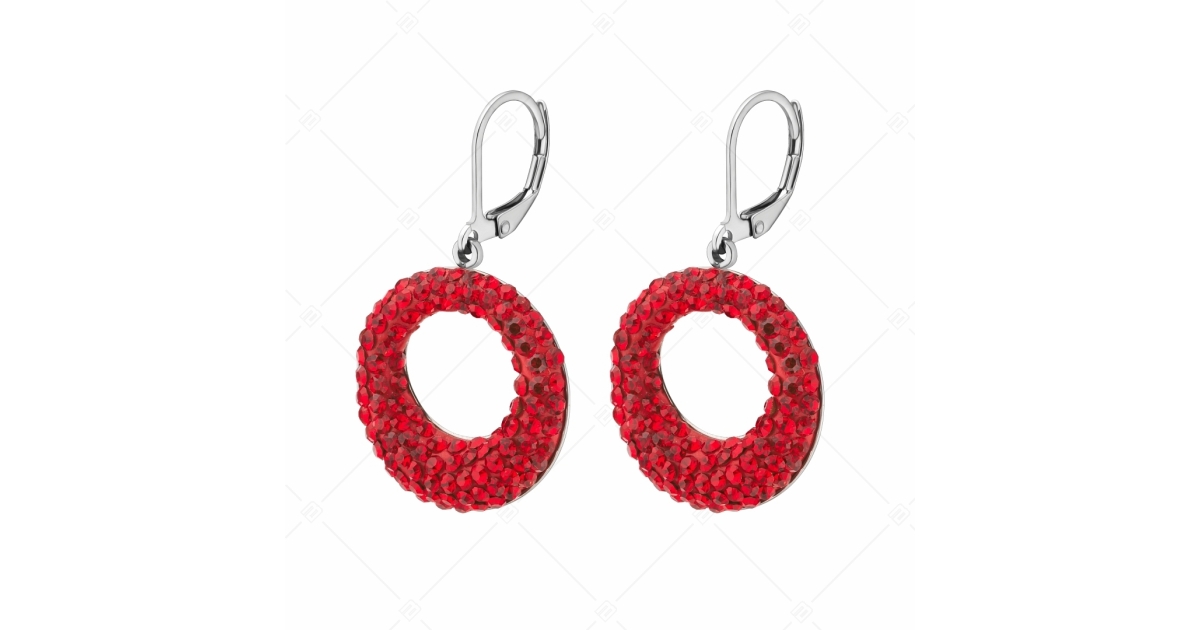 Piros színű, cseh kristályokkal kirakott kerek formájú, csüngő fülbevaló. 316L orvosi rozsdamentes acél ékszer, amely anyagának köszönhetően rendkívül tartós, nem kopik, nem színeződik el.