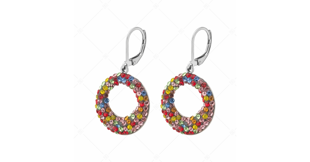 Többszínű, cseh kristályokkal kirakott kerek formájú, csüngő fülbevaló. 316L orvosi rozsdamentes acél ékszer, amely anyagának köszönhetően rendkívül tartós, nem kopik, nem színeződik el.