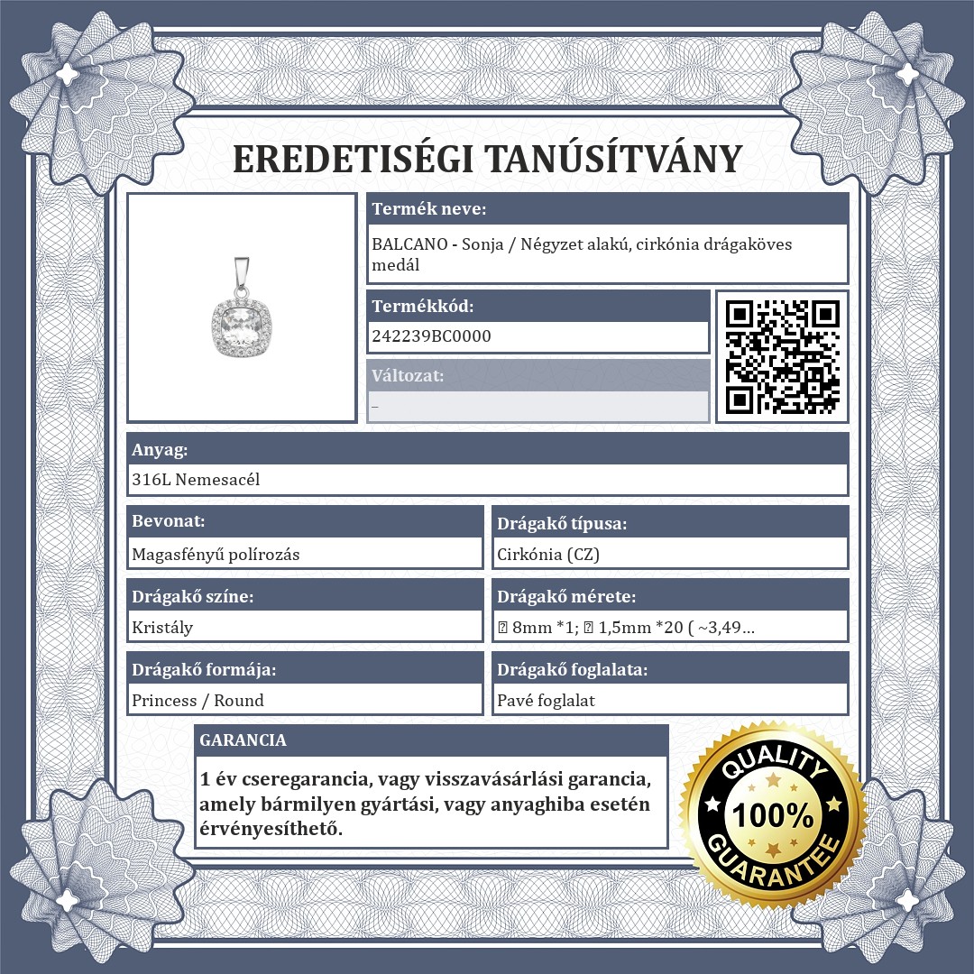Elegáns, négyzet alakú cirkónia drágakövekkel díszített medál. Antiallergén, 316L nemesacél ékszer, magasfényű polírozással. Középen egy nagyobb, négyzet alakú kő díszíti, amelyet körbe, ragyogó, víztiszta, kisebb, kerek cirkónia kövek fognak közre, amely még csillogóbbá teszi az ékszert.