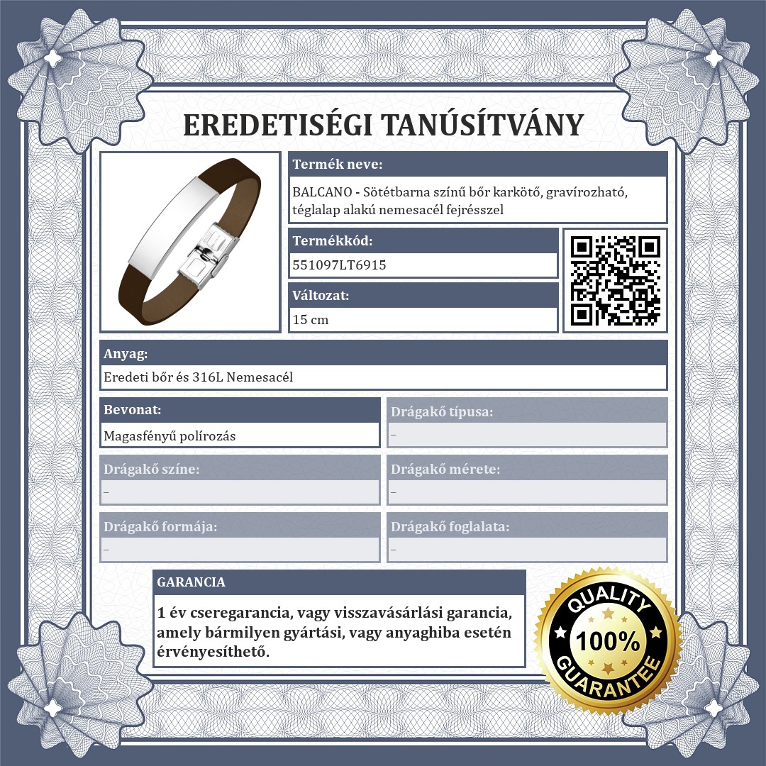 Sötétbarna színű, valódi marhabőr karkötő, amit egy téglalap alakú, magasfényű polírozással ellátott 316L nemesacél fejrész díszít. Felülete sima, így egyedi ékszer készíthető belőle gravírozással.