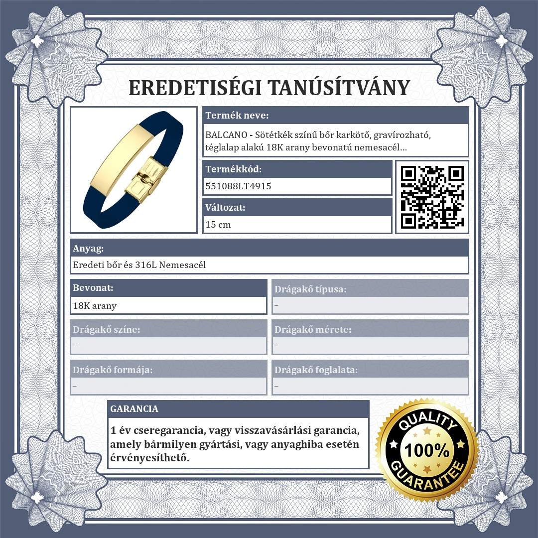 Sötétkék színű, valódi marhabőr karkötő, amit egy téglalap alakú, 18K arany bevonatú 316L nemesacél fejrész díszít. Felülete sima, így egyedi ékszer készíthető belőle gravírozással.