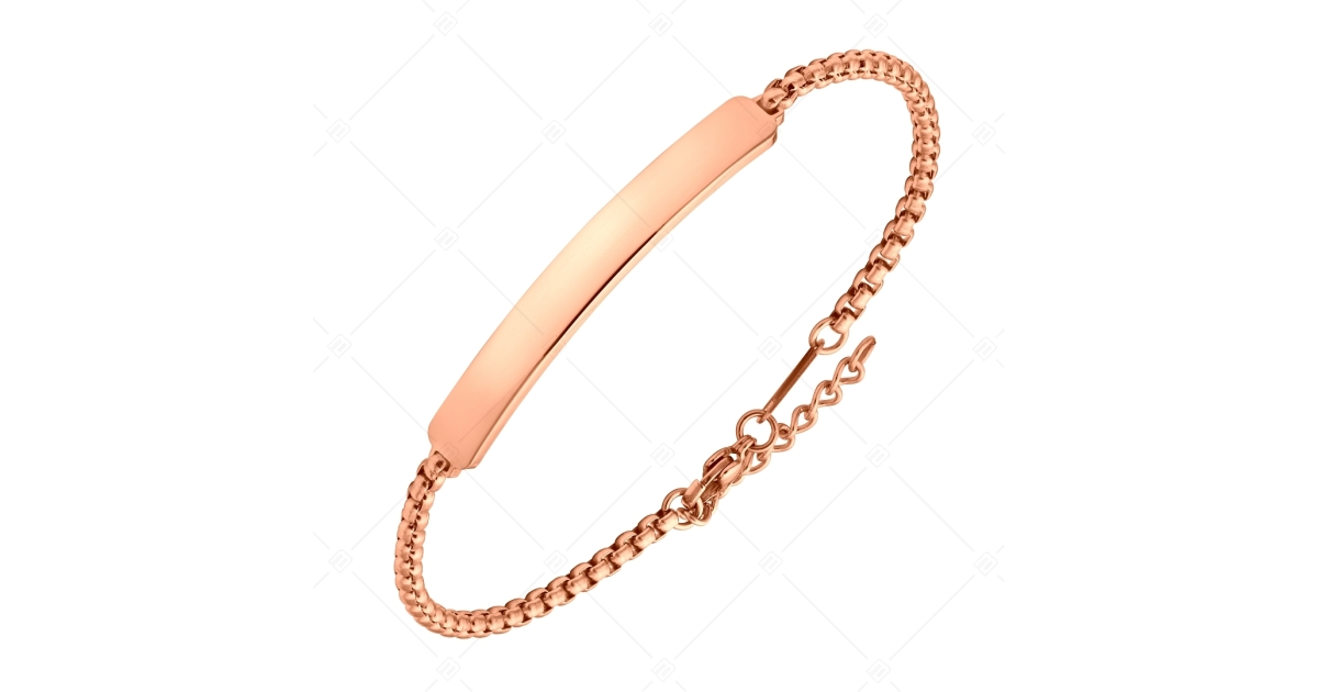 Impozáns, klasszikus, kerekített velencei kocka lánc típusú karkötő, gravírozható, téglalap alakú fejrésszel. 316L orvosi, rozsdamentes, antiallergén nemesacél ékszer, 18K rozé arany bevonattal.