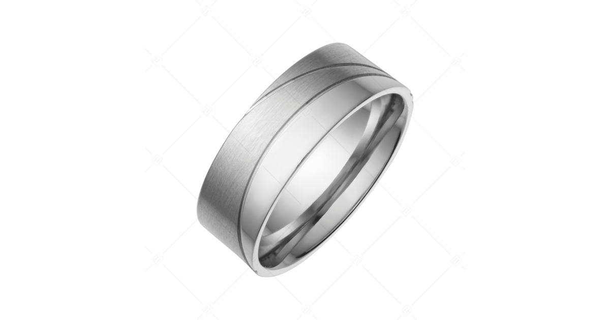 Antiallergén 316L nemesacél karikagyűrű, íves vonalakkal, amelyek elválasztják a polírozott részt a matt, szálrahúzott felületű résztől. Káprázatos kialakítású elegáns ékszer.