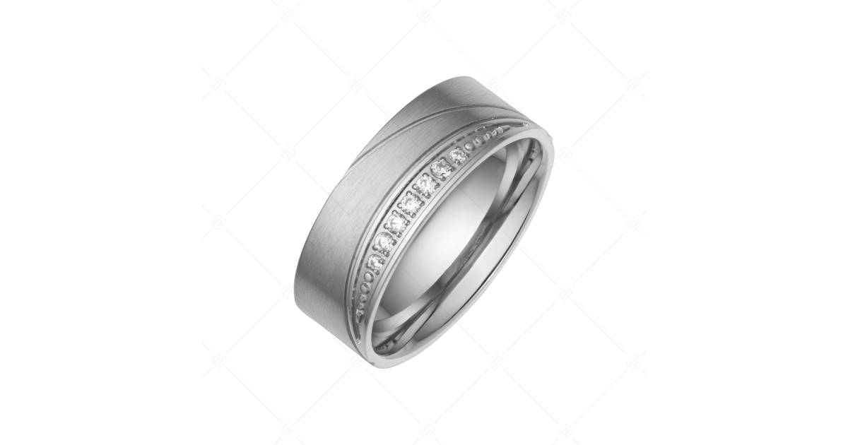 Antiallergén 316L nemesacél karikagyűrű, íves vonalakkal, amelyek elválasztják a polírozott részt a matt, szálrahúzott felületű résztől. Káprázatos csillogású, az íves vonalat követve elhelyezett, víztiszta cirkónia ékkövekkel díszített elegáns ékszer.