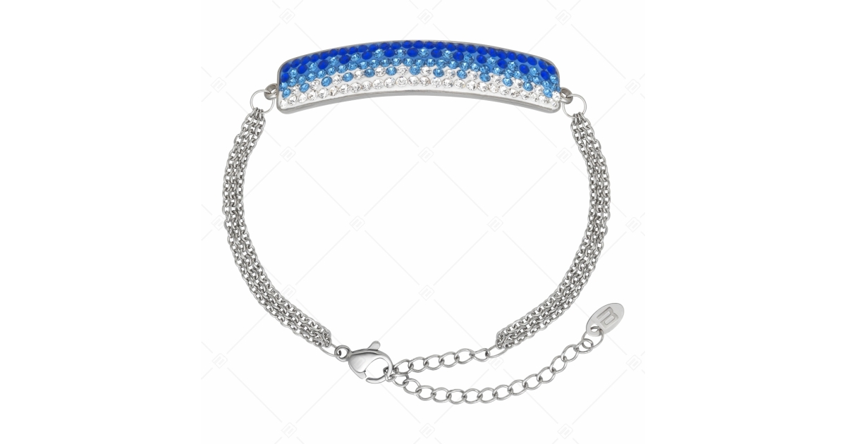 Antiallergén, 316L nemesacél, magasfényű polírozású ékszer. Háromsoros lapított szemes anker láncokból álló, állítható méretű, delfinkapcsos karkötő. Divatos, erősen csillogó víztiszta és kék színű cseh kristályokkal kirakott íves fejrésszel.