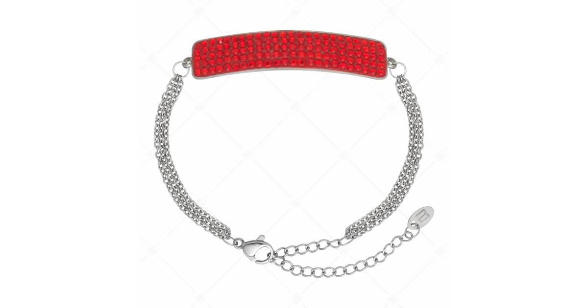 Antiallergén, 316L nemesacél, magasfényű polírozású ékszer. Háromsoros lapított szemes anker láncokból álló, állítható méretű, delfinkapcsos karkötő. Divatos, erősen csillogó piros színű cseh kristályokkal kirakott íves fejrésszel.