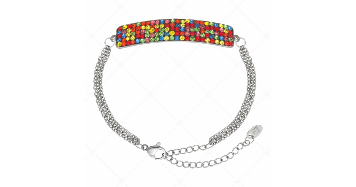 Antiallergén, 316L nemesacél, magasfényű polírozású ékszer. Háromsoros lapított szemes anker láncokból álló, állítható méretű, delfinkapcsos karkötő. Divatos, erősen csillogó többszínű cseh kristályokkal kirakott íves fejrésszel.