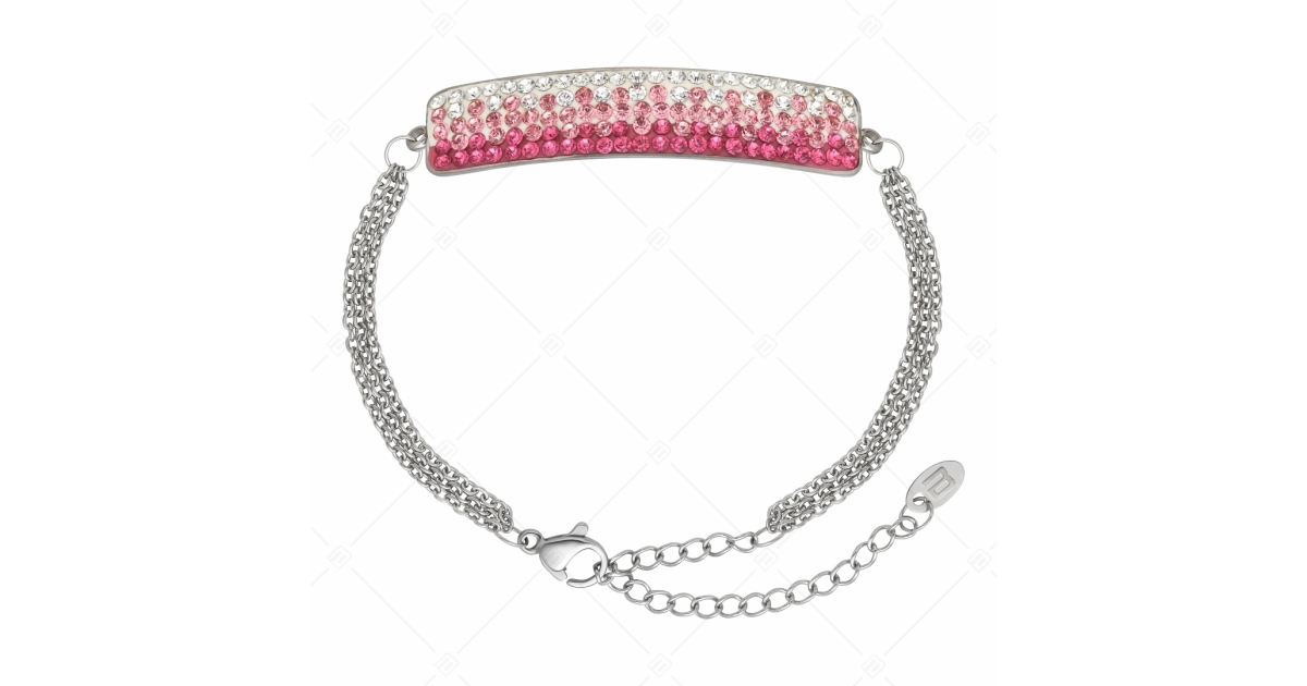 Antiallergén, 316L nemesacél, magasfényű polírozású ékszer. Háromsoros lapított szemes anker láncokból álló, állítható méretű, delfinkapcsos karkötő. Divatos, erősen csillogó víztiszta és rózsaszín cseh kristályokkal kirakott íves fejrésszel.