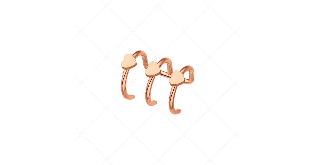 Három részes hengeres anyagból készült fülgyűrű magasfényű polírozással és 18K rozé arany bevonattal. Három szív mintával. Divatos és egyben kényelmes viselet. Az anyaga allergiamentes 316L orvosi nemesacél. Mutatós kiegészítője lehet egy már meglévő fülbevalónak, de vakár válogathatsz is további, hozzá passzoló ékszereket a BALCANO webshop óriási kínálatából. Nem szükséges hozzá füllyuk.