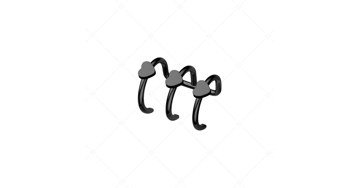 Három részes hengeres anyagból készült fülgyűrű magasfényű polírozással és fekete PVD bevonattal. Három szív mintával. Divatos és egyben kényelmes viselet. Az anyaga allergiamentes 316L orvosi nemesacél. Mutatós kiegészítője lehet egy már meglévő fülbevalónak, de vakár válogathatsz is további, hozzá passzoló ékszereket a BALCANO webshop óriási kínálatából. Nem szükséges hozzá füllyuk.