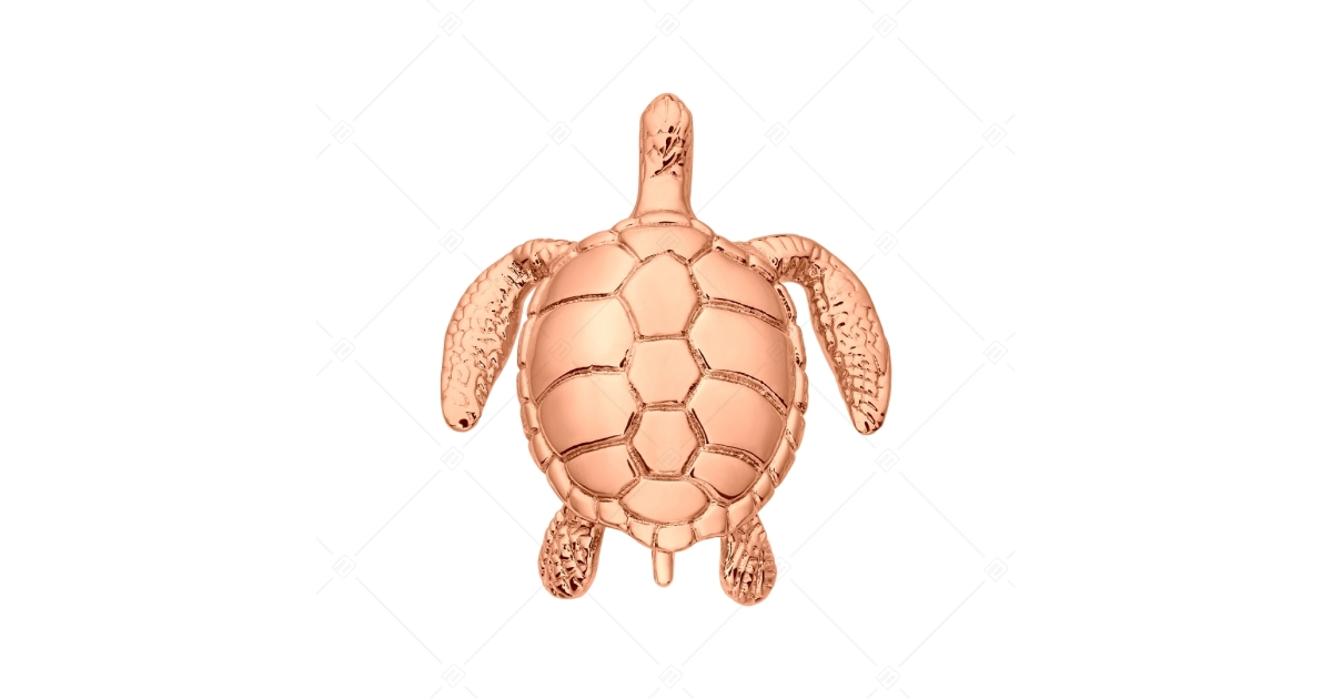 Teknős medál 316L orvosi rozsdamenetes nemesacélból 18K rozé arany bevonattal. Anyagának köszönhetően allergiamentes, nem kopik és nem szineződik el.