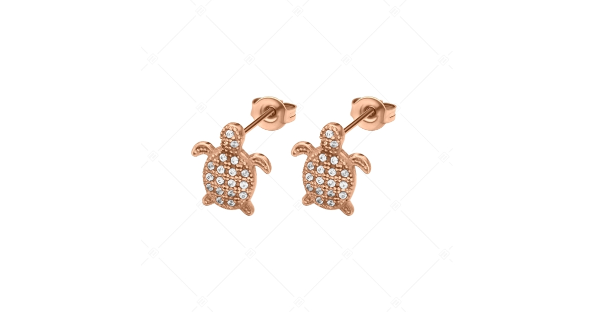 Teknősbéka alakú bedugós fülbevaló, víztiszta, csillogó, cirkónia drágakövekkel díszítve. 316L orvosi antiallergén, rozsdamentes nemesacél ékszer, 18K rozé arany bevonattal.