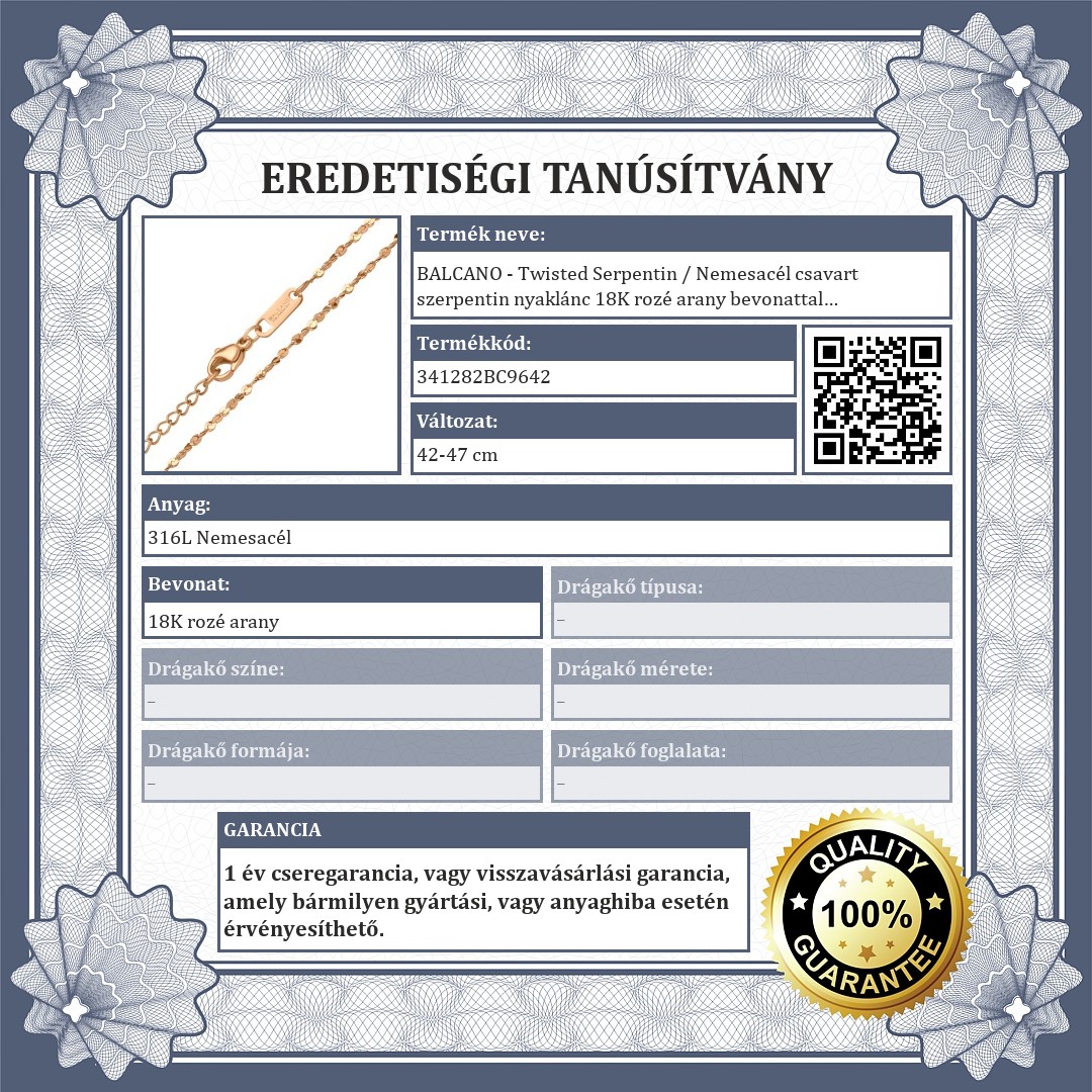 Elegáns, antiallergén, 316L nemesacél csavart szerpentin szemes nyaklánc. A "Serpentin" jelentése: kígyózó, ami a nyaklánc jellegzetes formájára utal, de ennél a típusnál még egy extra csavarást is belevittek a formába. Kiváló minőségű anyagának köszönhetően nem mattul, nem kopik meg a használata során. Állítható méretű, delfin kapoccsal és csodás 18K rozé arany bevonattal.