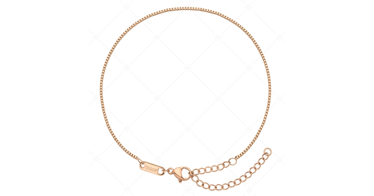 Kiváló minőségű, antiallergén, 316L nemesacél, velencei kocka lánc típusú bokalánc, 18K rozé arany bevonattal. Anyagának köszönhetően használat során nem kopik meg, nem rozsdásodik, nem mattul el.