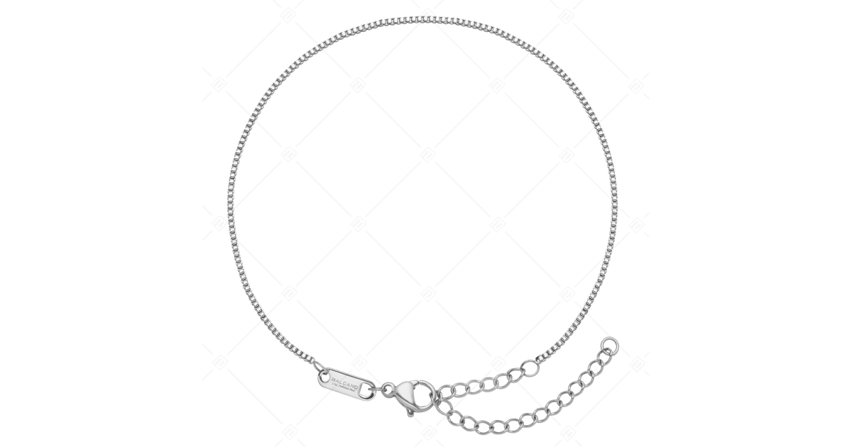 Kiváló minőségű, antiallergén, 316L nemesacél, velencei kocka lánc típusú bokalánc, magasfényű polírozással. Anyagának köszönhetően használat során nem kopik meg, nem rozsdásodik, nem mattul el.