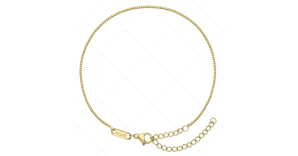 Kiváló minőségű, antiallergén, 316L nemesacél, velencei kocka lánc típusú bokalánc, 18K arany bevonattal. Anyagának köszönhetően használat során nem kopik meg, nem rozsdásodik, nem mattul el.