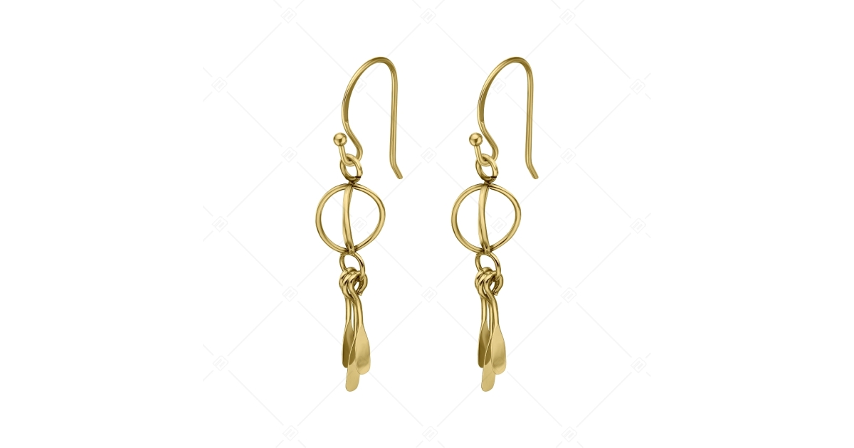 Kis csavart, íves gömb alakú 316L nemesacél csüngő fülbevaló kis csüngő, nyelv alakú díszekkel, 18K arany bevonattal. Allergiamentes ékszer így bárki nyugodtan viselheti. Anyagának köszönhetően nem színeződik, nem kopik el és a gyógyvízre vagy tisztítószerekre sem érzékeny. Egyedi és elegáns bármilyen alkalomra.