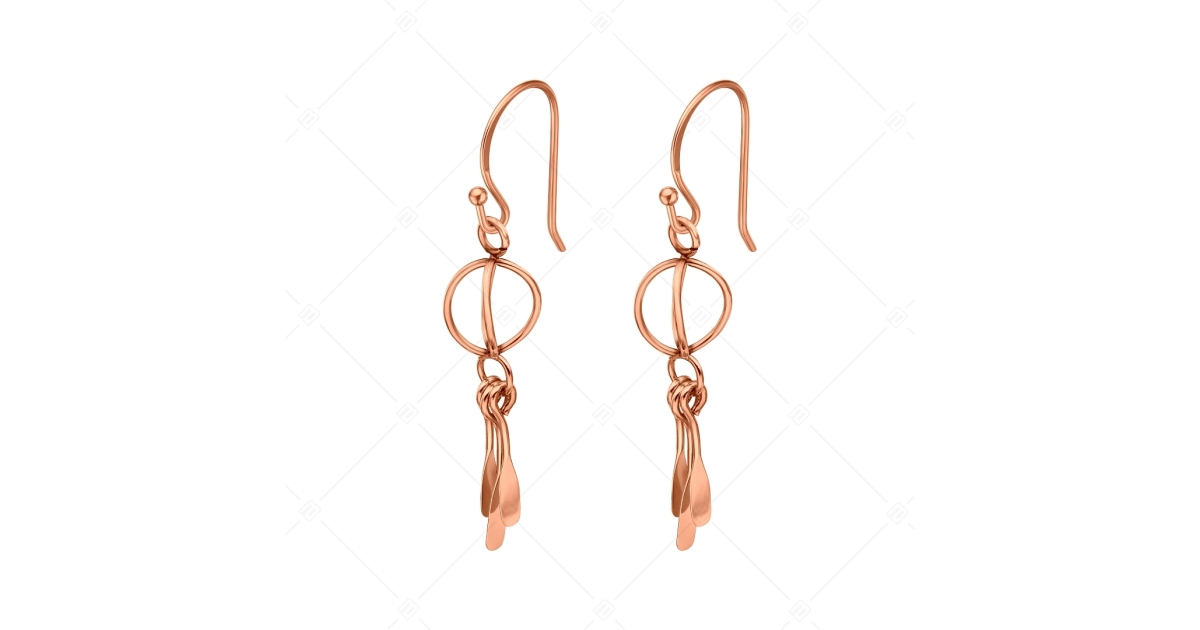 Kis csavart, íves gömb alakú 316L nemesacél csüngő fülbevaló kis csüngő, nyelv alakú díszekkel, 18K rozé arany bevonattal. Allergiamentes ékszer így bárki nyugodtan viselheti. Anyagának köszönhetően nem színeződik, nem kopik el és a gyógyvízre vagy tisztítószerekre sem érzékeny. Egyedi és elegáns bármilyen alkalomra.