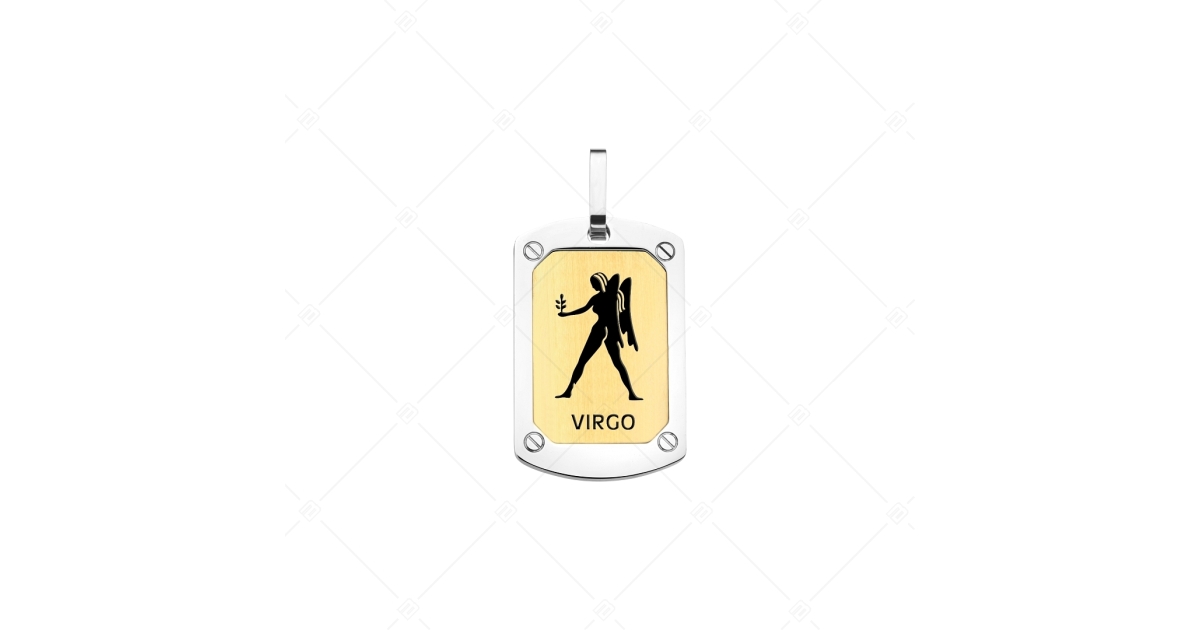 Antiallergén, nemesacél, téglalap alakú horoszkópos medál a Szűz csillagjegy képével díszítve. 316L orvosi, rozsdamentes acél ékszer, amely anyagának köszönhetően rendkívül tartós. Magasfényű polírozással, 18K arany bevonatos matt,szálra húzott felületen található a bemaratással és festéssel készült állatövi jegyek szimbóluma.