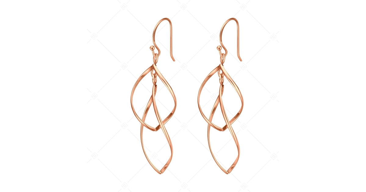 Két részből álló kissé csavart, íves alakú 316L nemesacél csüngő fülbevaló 18K rozé arany bevonattal. Allergiamentes ékszer így bárki nyugodtan viselheti. Anyagának köszönhetően nem színeződik, nem kopik el és a gyógyvízre vagy tisztítószerekre sem érzékeny. Egyedi és elegáns bármilyen alkalomra.
