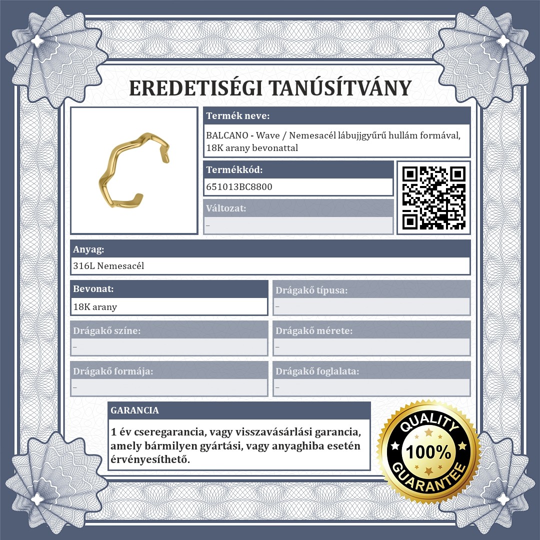 Allergiamentes 316L orvosi, rozsdamentes acél ékszer, 18K arany bevonattal. Anyagának köszönhetően jól bírja a vizet és kopásálló. A lábujjgyűrű hullámokat ábrázol.