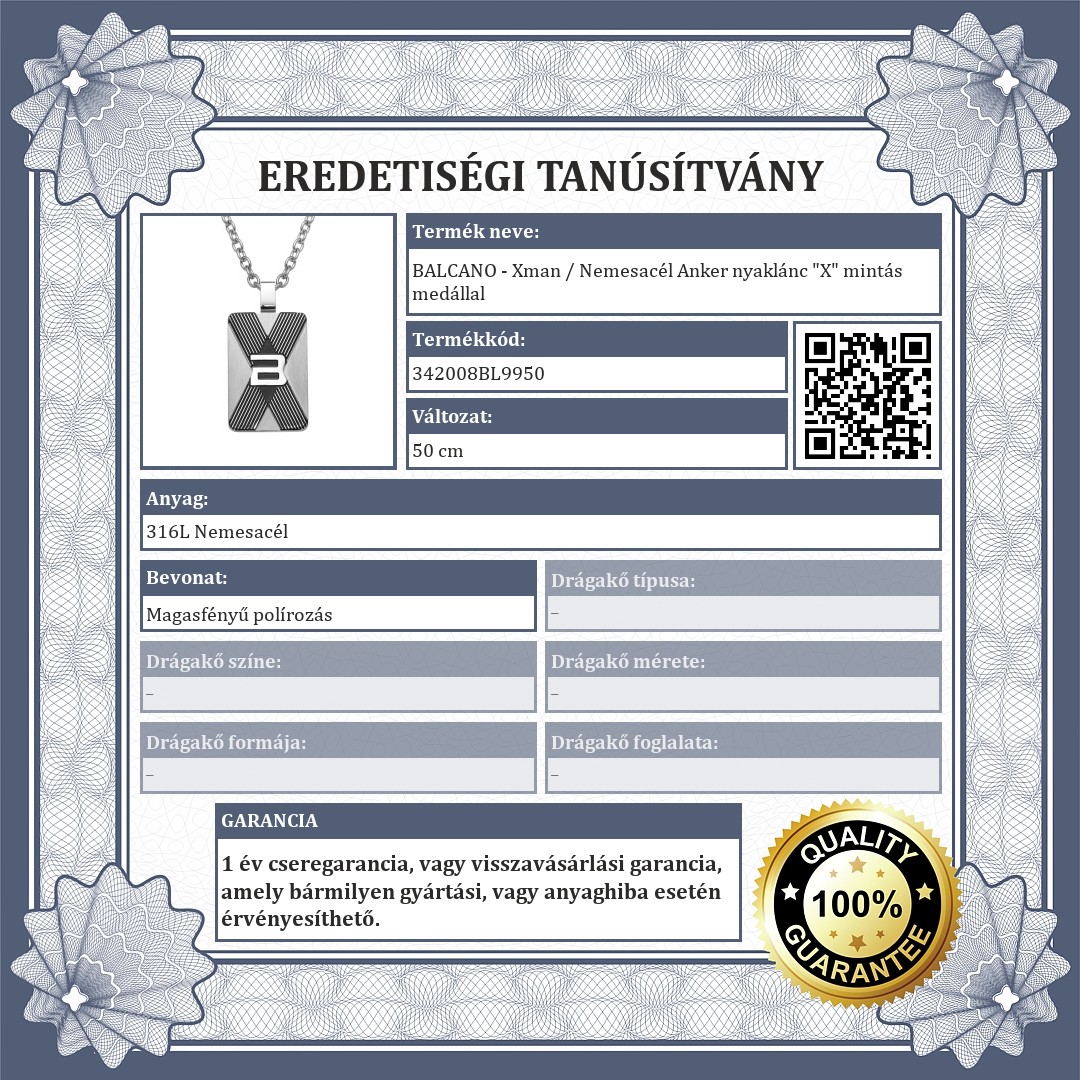 Prémium minőségű, antiallergén, nemesacél, anker nyaklánc, magasfényű polírozással, delfin kapoccsal ellátva. Medálon középen egy fekete színű X minta található, közepén a BALCANO márka kidomborodó logója díszíti.