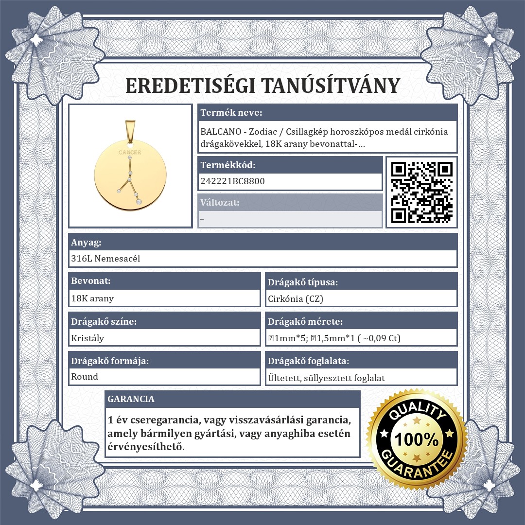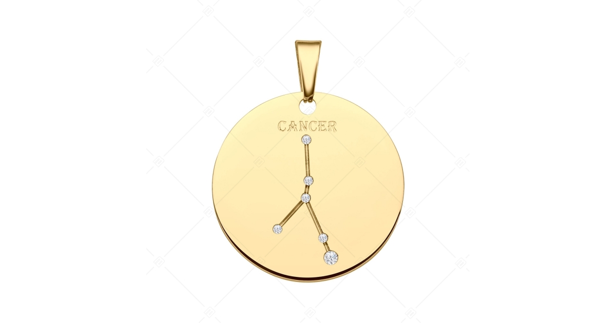 Rák csillagképpel díszített medál. 316L orvosi nemesacél kiegészítő, 18K arany bevonattal. A csillagkép vésett mintában található, melyet csillogó cirkónia kövek díszítenek, mint apró fényes kis csillagok.