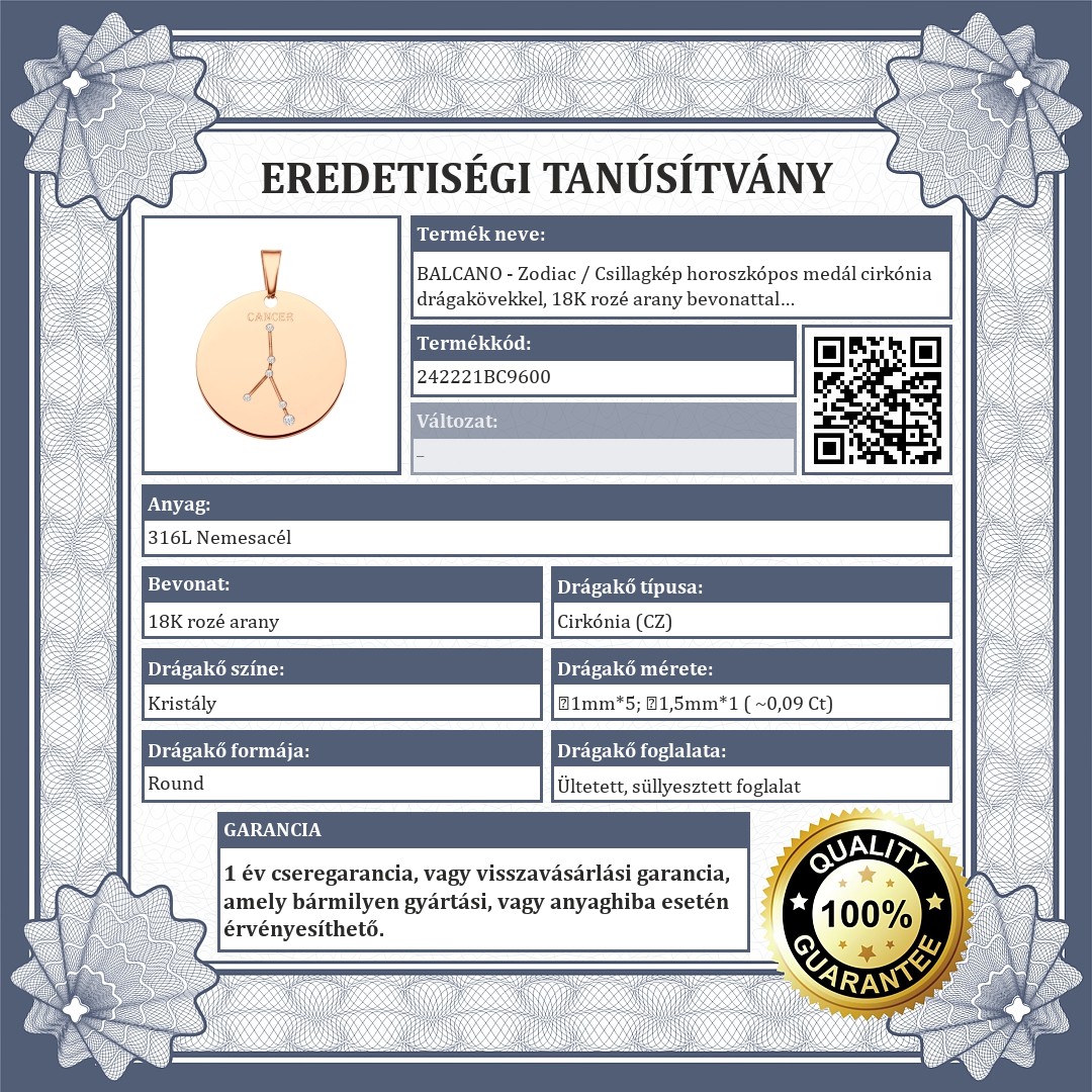 Rák csillagképpel díszített medál. 316L orvosi nemesacél kiegészítő, 18K rozé arany bevonattal. A csillagkép vésett mintában található, melyet csillogó cirkónia kövek díszítenek, mint apró fényes kis csillagok.