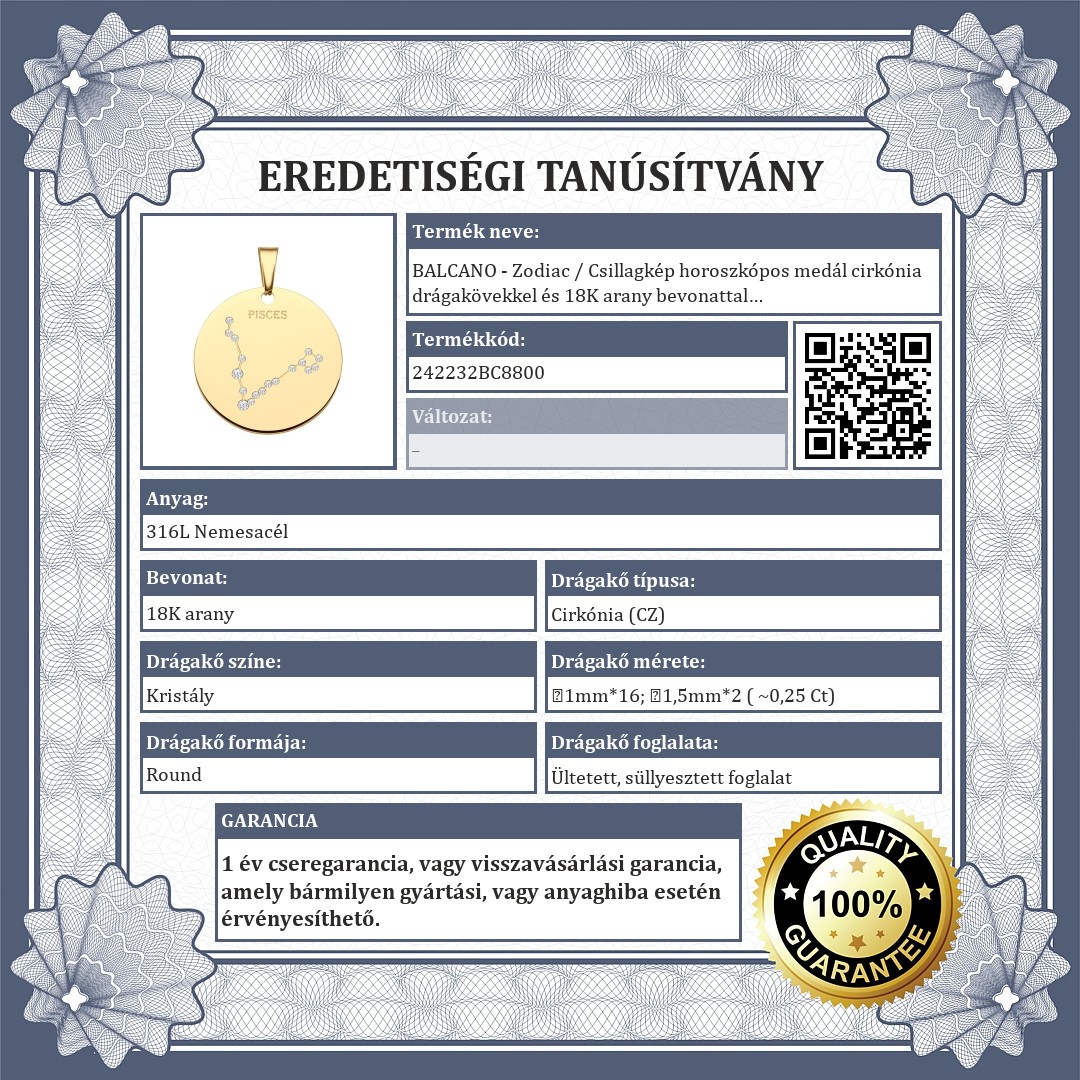 Halak csillagképpel díszített medál. 316L orvosi nemesacél kiegészítő, 18K arany bevonattal. A csillagkép vésett mintában található, melyet csillogó cirkónia kövek díszítenek, mint apró fényes kis csillagok.