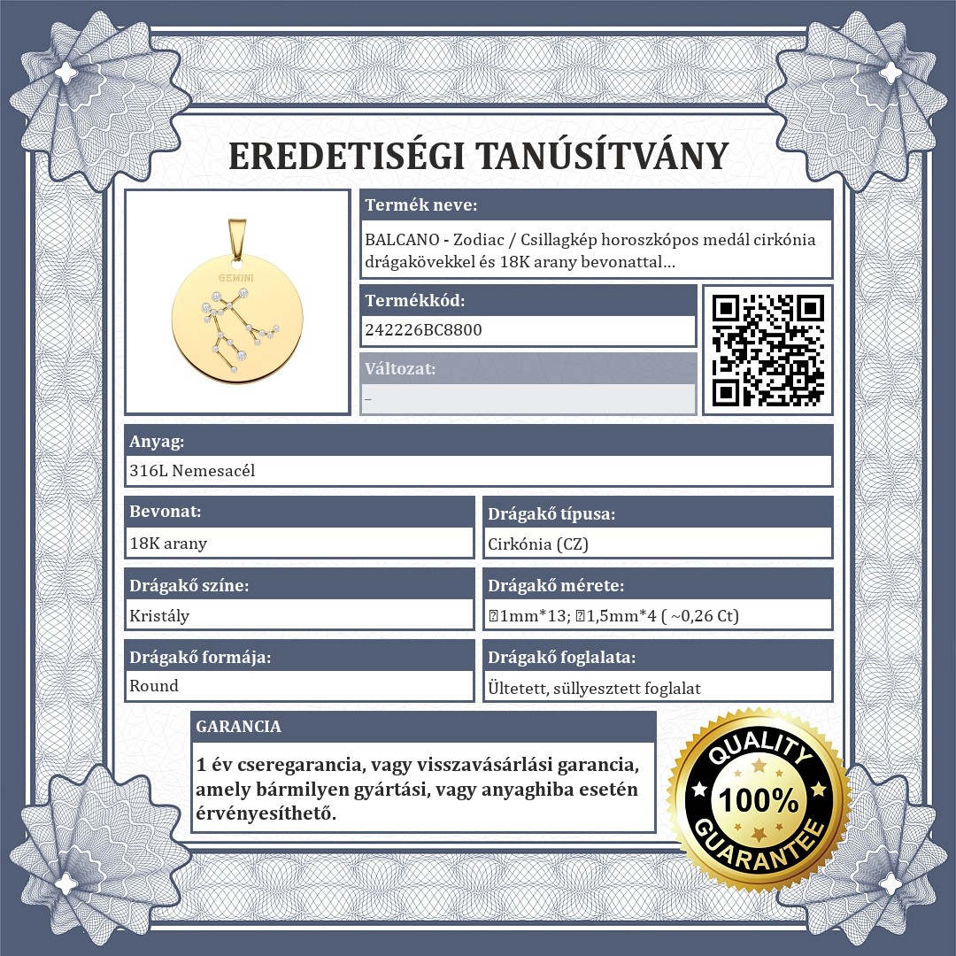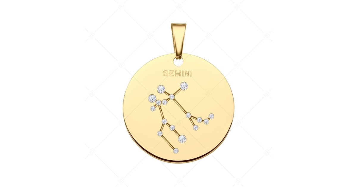 Ikrek csillagképpel díszített medál. 316L orvosi nemesacél kiegészítő, 18K arany bevonattal. A csillagkép vésett mintában található, melyet csillogó cirkónia kövek díszítenek, mint apró fényes kis csillagok.