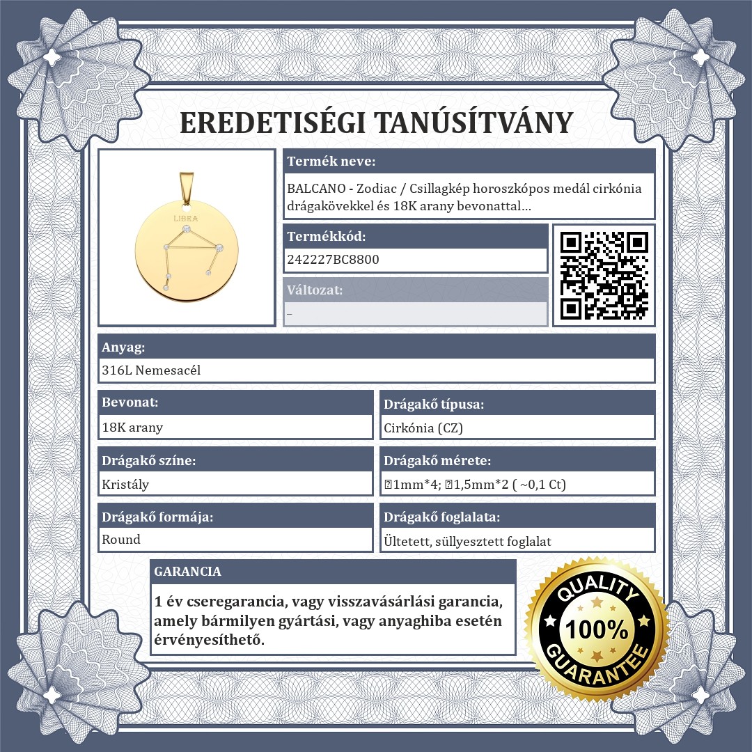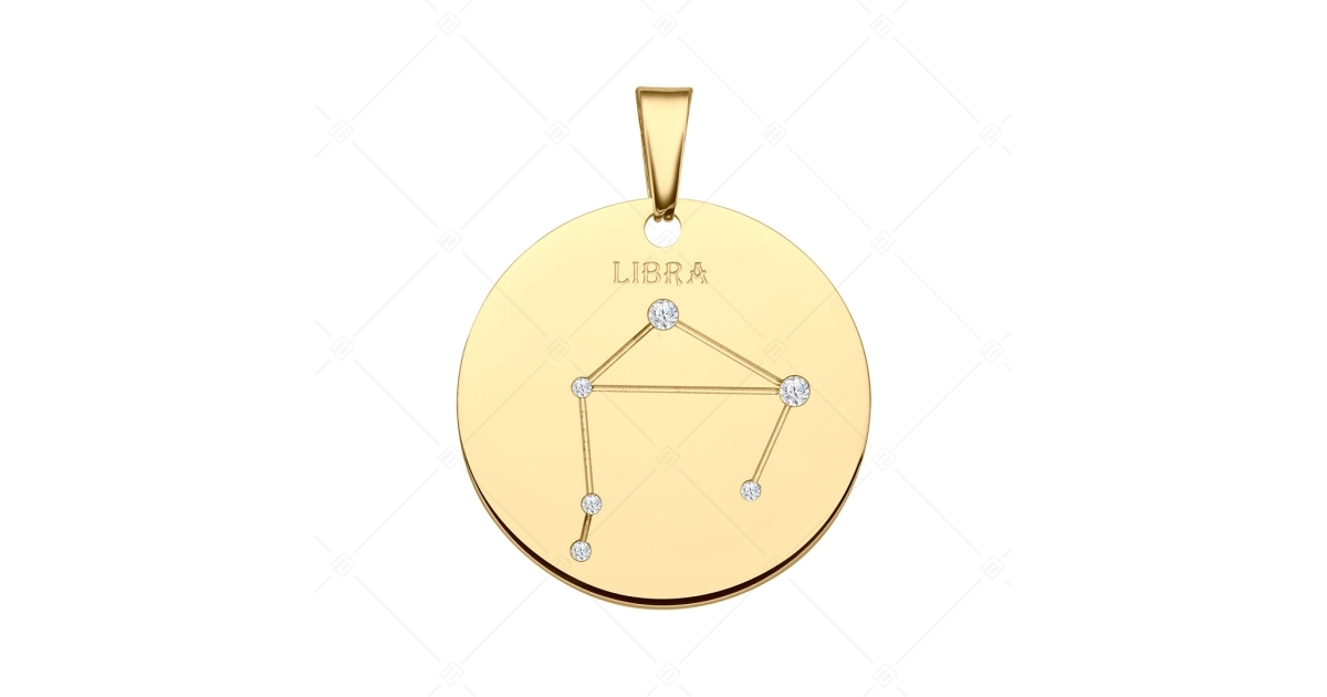 Mérleg csillagképpel díszített medál. 316L orvosi nemesacél kiegészítő, 18K arany bevonattal. A csillagkép vésett mintában található, melyet csillogó cirkónia kövek díszítenek, mint apró fényes kis csillagok.