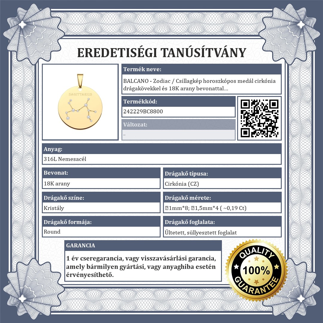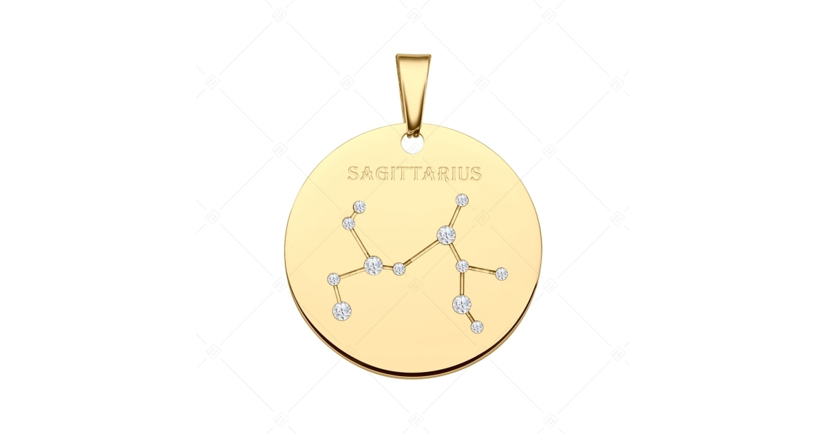 Nyilas csillagképpel díszített medál. 316L orvosi nemesacél kiegészítő, 18K arany bevonattal. A csillagkép vésett mintában található, melyet csillogó cirkónia kövek díszítenek, mint apró fényes kis csillagok.
