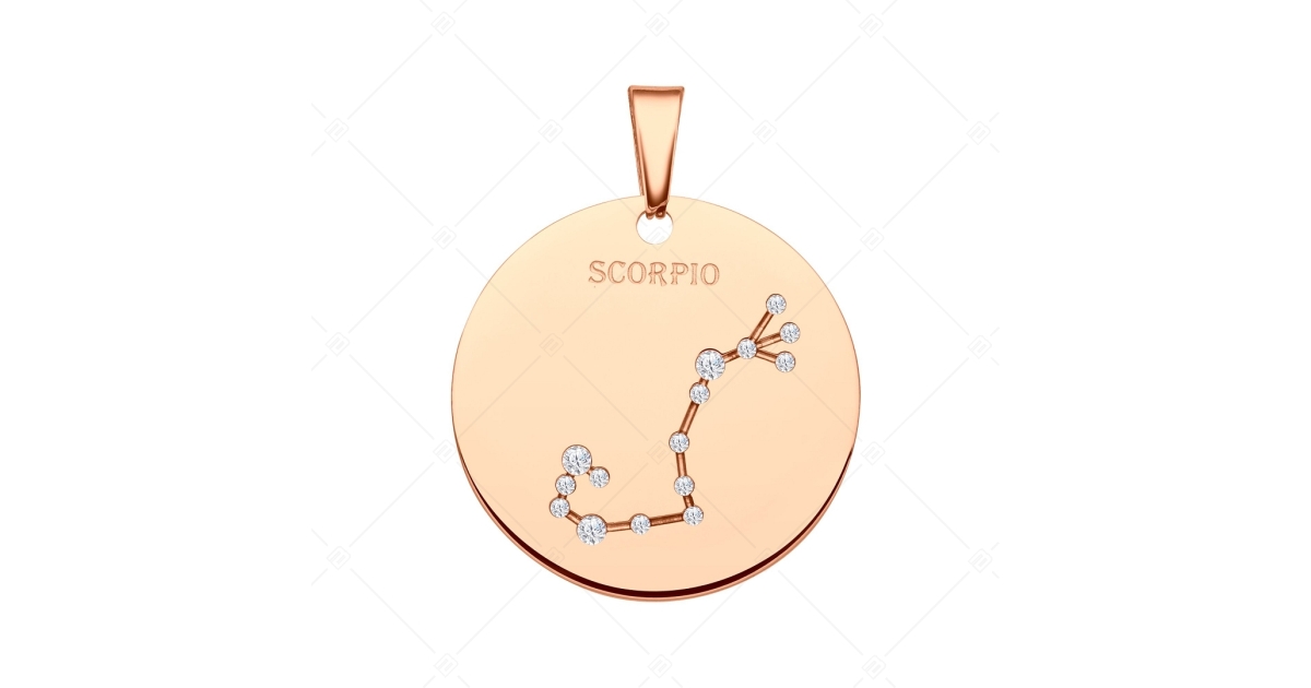 Skorpió csillagképpel díszített medál. 316L orvosi nemesacél kiegészítő, 18K rozé arany bevonattal. A csillagkép vésett mintában található, melyet csillogó cirkónia kövek díszítenek, mint apró fényes kis csillagok.
