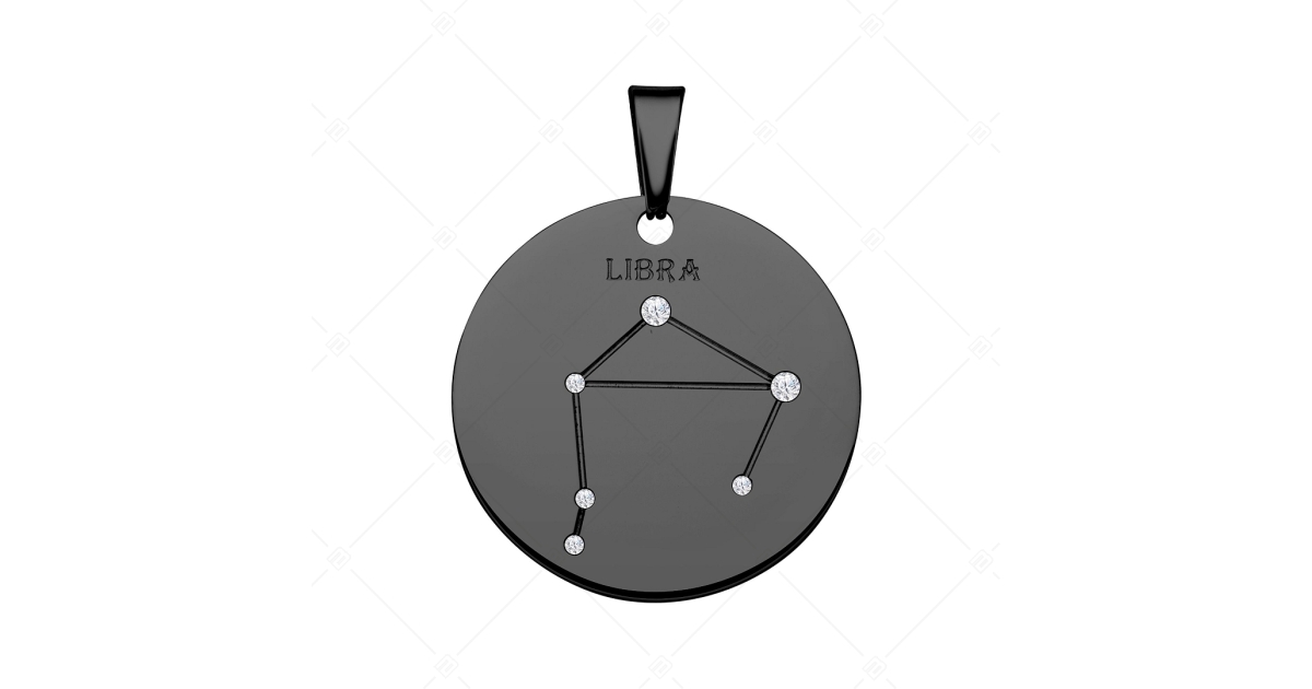 Mérleg csillagképpel díszített medál. 316L orvosi nemesacél kiegészítő, fekete, króm PVD bevonattal. A csillagkép vésett mintában található, melyet csillogó cirkónia kövek díszítenek, mint apró fényes kis csillagok.
