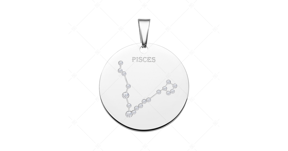Halak csillagképpel díszített medál. 316L orvosi nemesacél kiegészítő, magasfényű polírozással. A csillagkép vésett mintában található, melyet csillogó cirkónia kövek díszítenek, mint apró fényes kis csillagok.