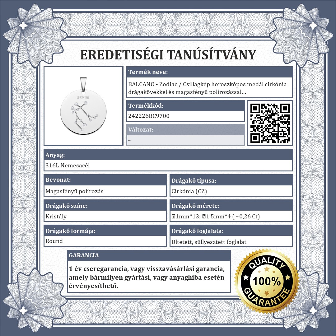 Ikrek csillagképpel díszített medál. 316L orvosi nemesacél kiegészítő, magasfényű polírozással. A csillagkép vésett mintában található, melyet csillogó cirkónia kövek díszítenek, mint apró fényes kis csillagok.