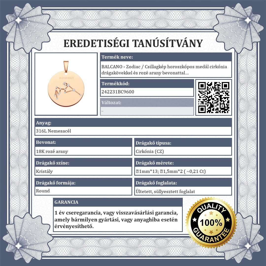 Vízöntő csillagképpel díszített medál. 316L orvosi nemesacél kiegészítő,18K rozé arany bevonattal. A csillagkép vésett mintában található, melyet csillogó cirkónia kövek díszítenek, mint apró fényes kis csillagok.